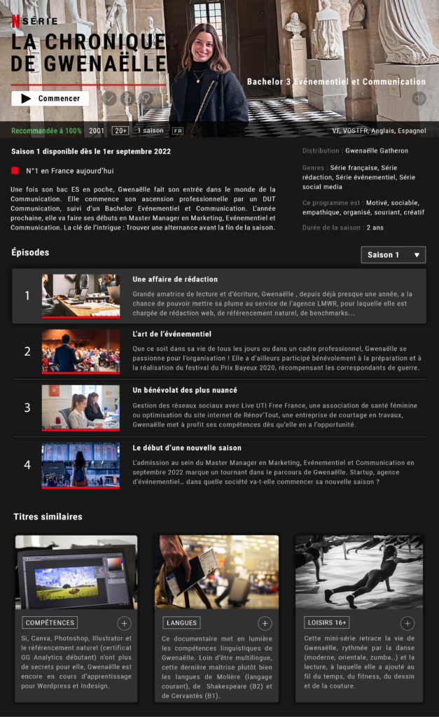 Et voici un exemple de CV, celui de Gwenaëlle Gatheron qui adore passer du temps devant Netflix et a repris les codes d’une plateforme 👇🏽